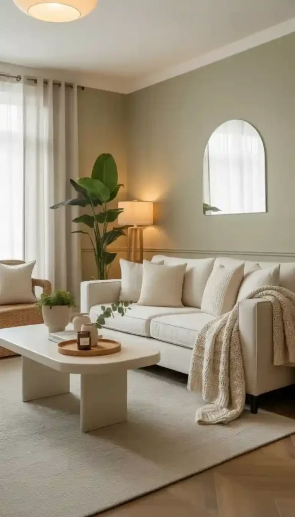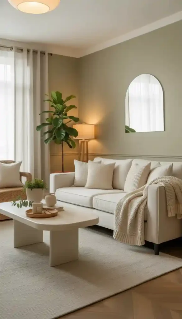 - Add one sage or dusty green cushion to create a gentle echo between the sofa and the wall