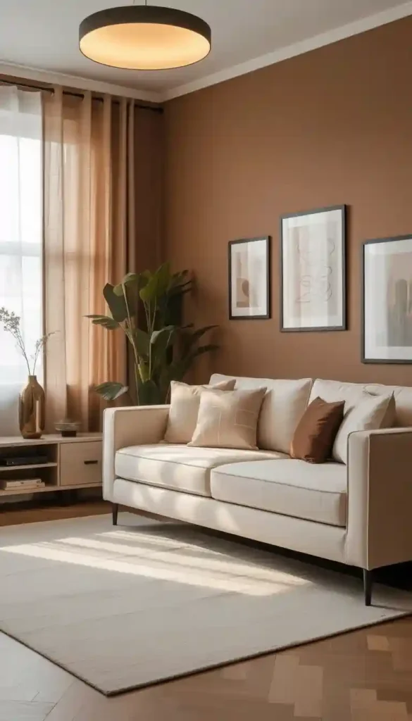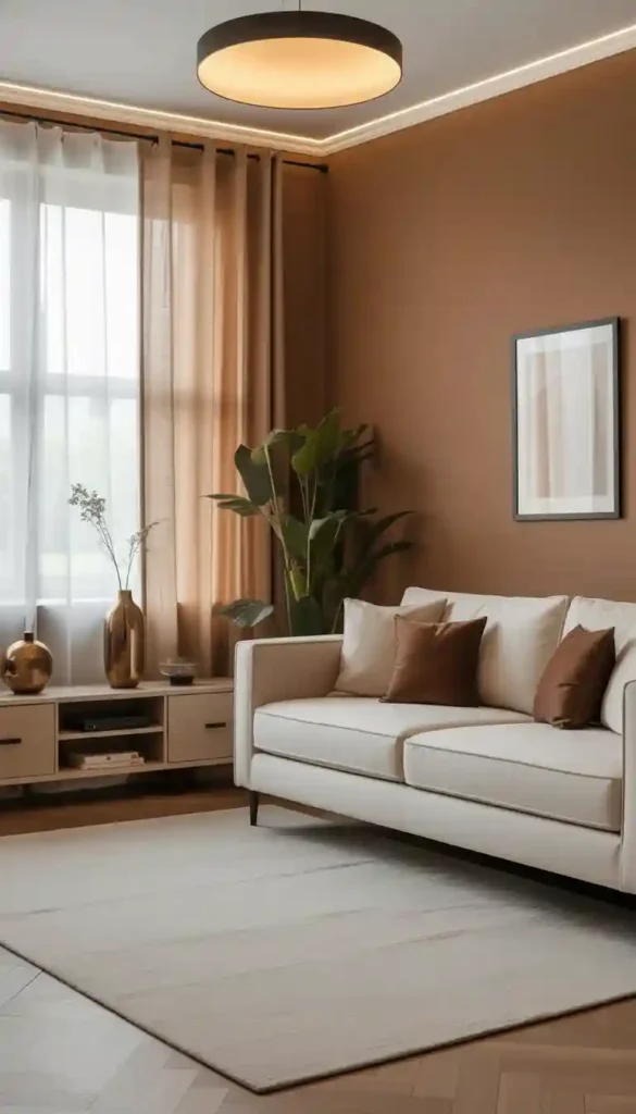 There is a particular kind of richness that comes from a deeper, warmer palette β not dark, not heavy, but genuinely enveloping. This cocoa-toned living room is that experience. It uses warm brown tones on the walls as a backdrop for cream upholstery and soft, layered textures to create a space that feels simultaneously sophisticated and deeply, genuinely cozy.