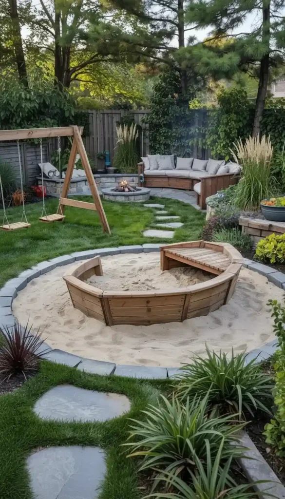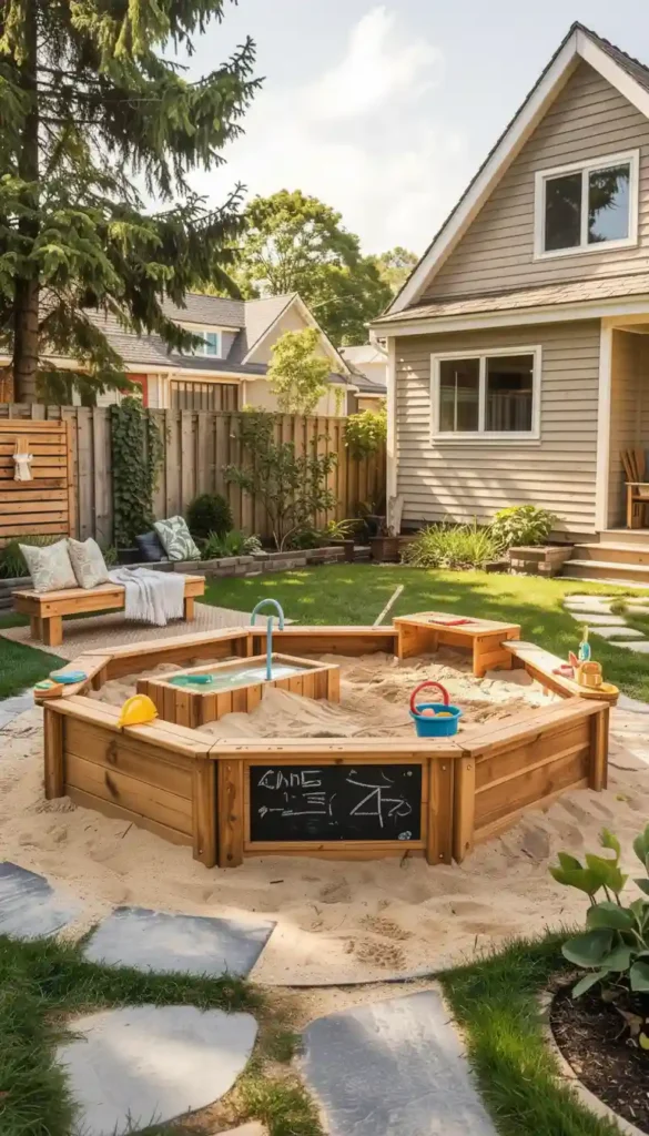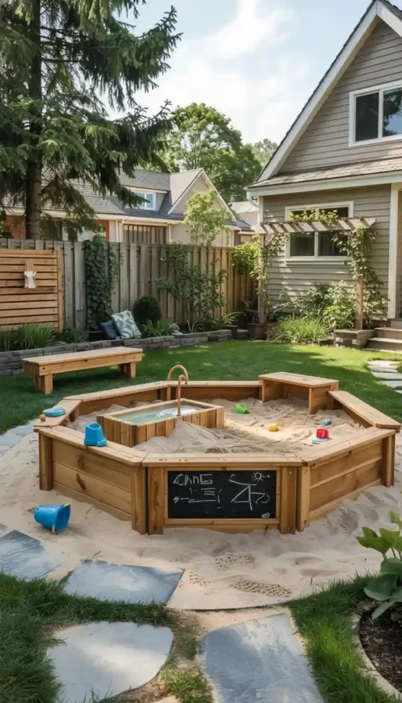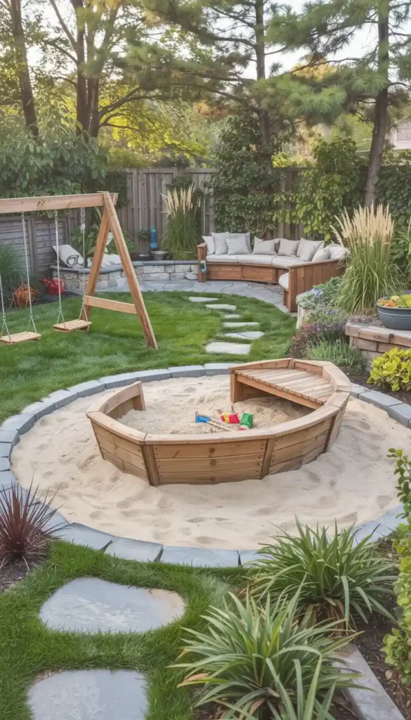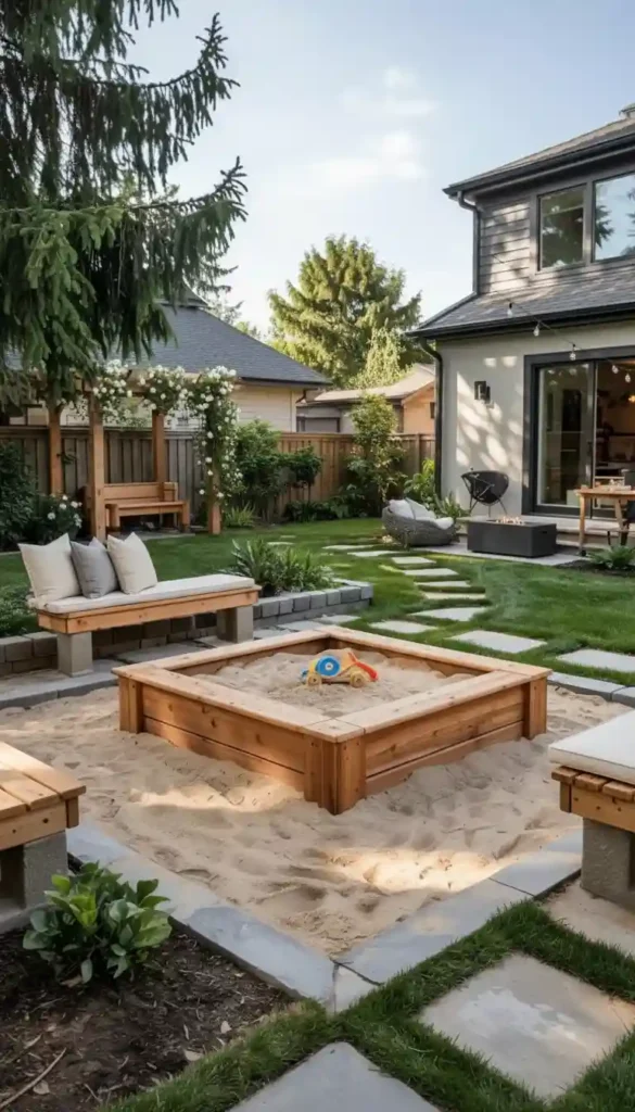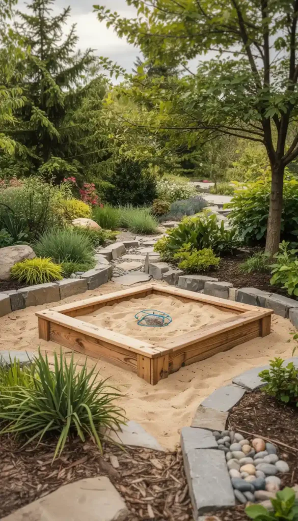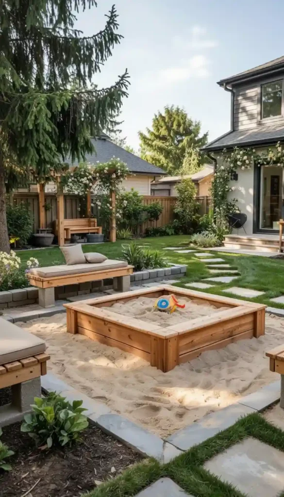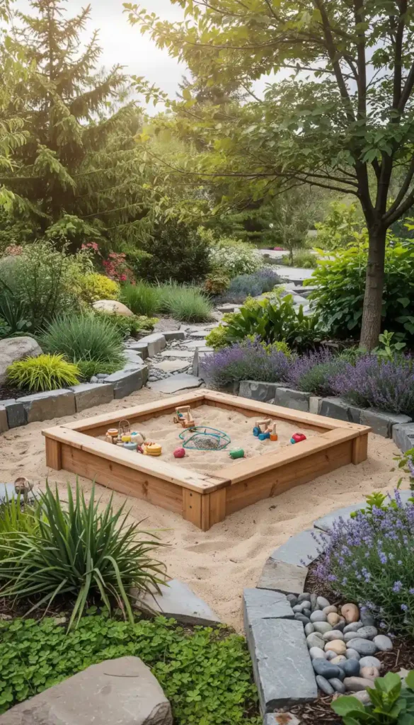A well-placed sandbox near a shaded pergola or large tree works beautifully. It feels natural, functional, and easy to supervise.