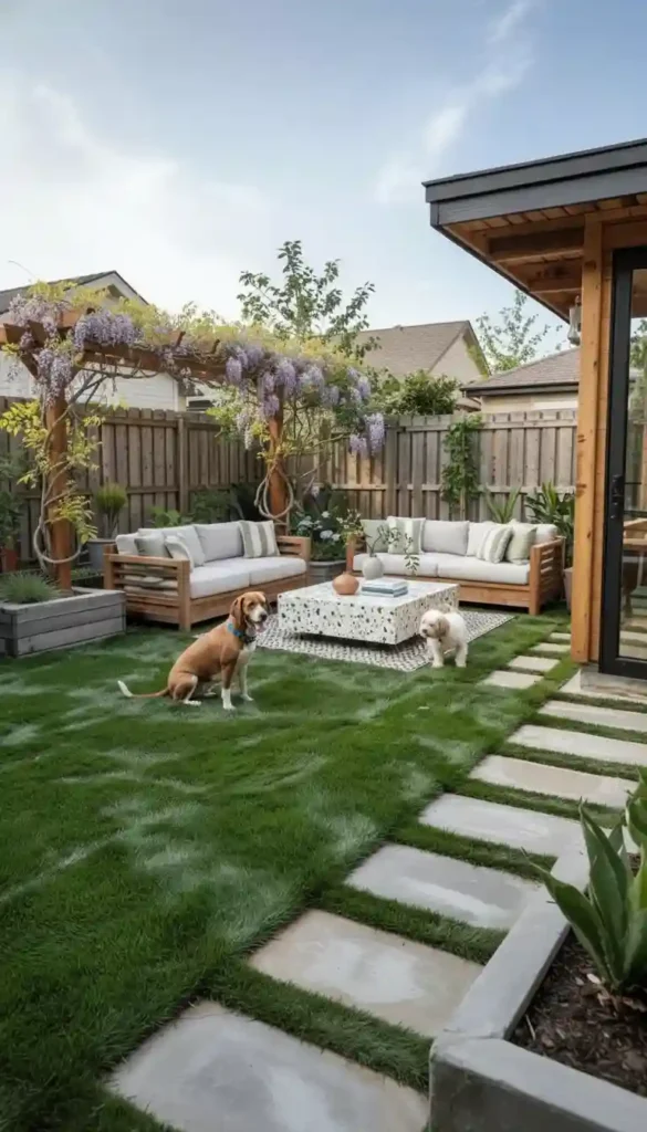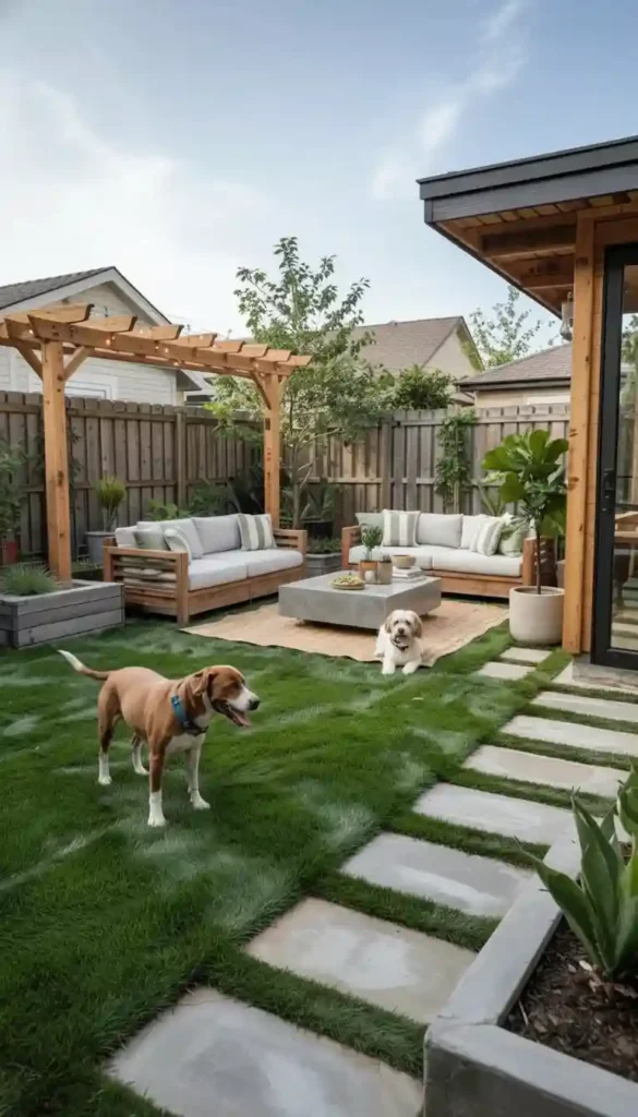 Zone 2 – The Human Lounge Area: This is your space. Use weather-resistant outdoor sofas with washable cushion covers. Add a low composite or treated wood coffee table. Keep this zone slightly elevated or separated with low edging to signal the boundary to your dog.