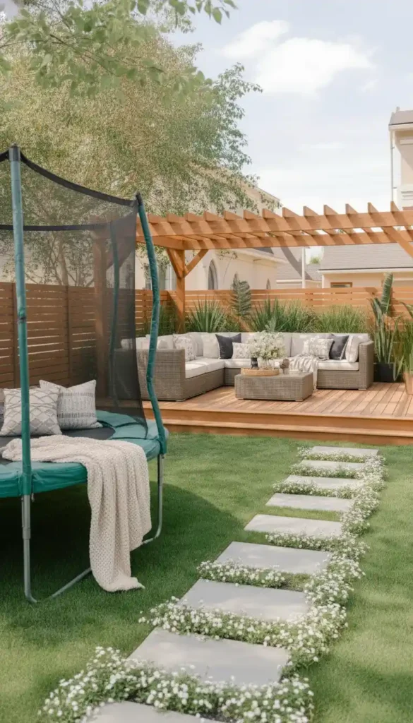 One of the most reliable layout strategies for families is the opposite-end principle. The adult lounge area goes near the house. The play zone goes toward the back. The two anchor points create a natural flow across the entire yard.