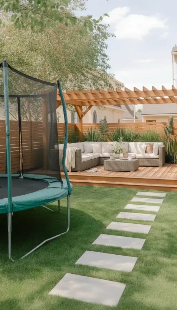 A trampoline placed in the center of a yard dominates the entire visual space. Pushed to the back, it becomes a designated feature in the play zone — contained, purposeful, and far less visually overwhelming.
