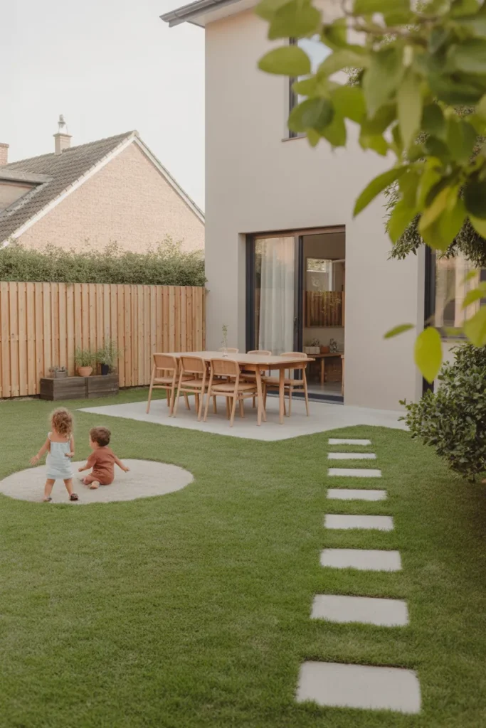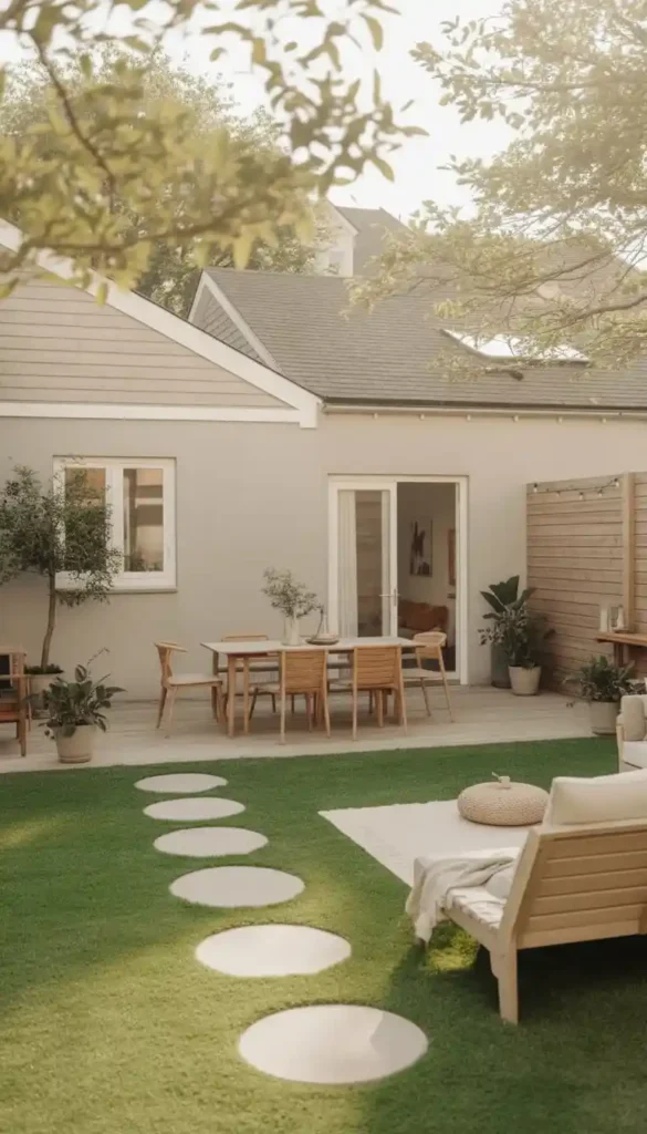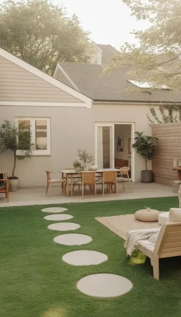 One of the most effective and low-cost ways to define movement in a modern family backyard is a stepping stone path. A simple grid — evenly spaced flat stones across a soft lawn — instantly creates structure without walls or fences.