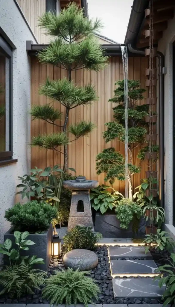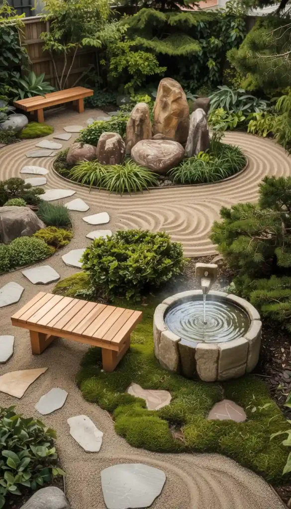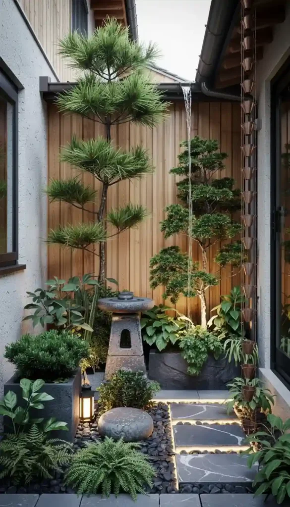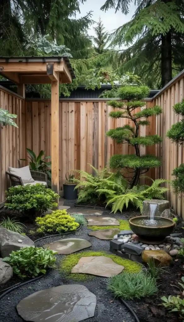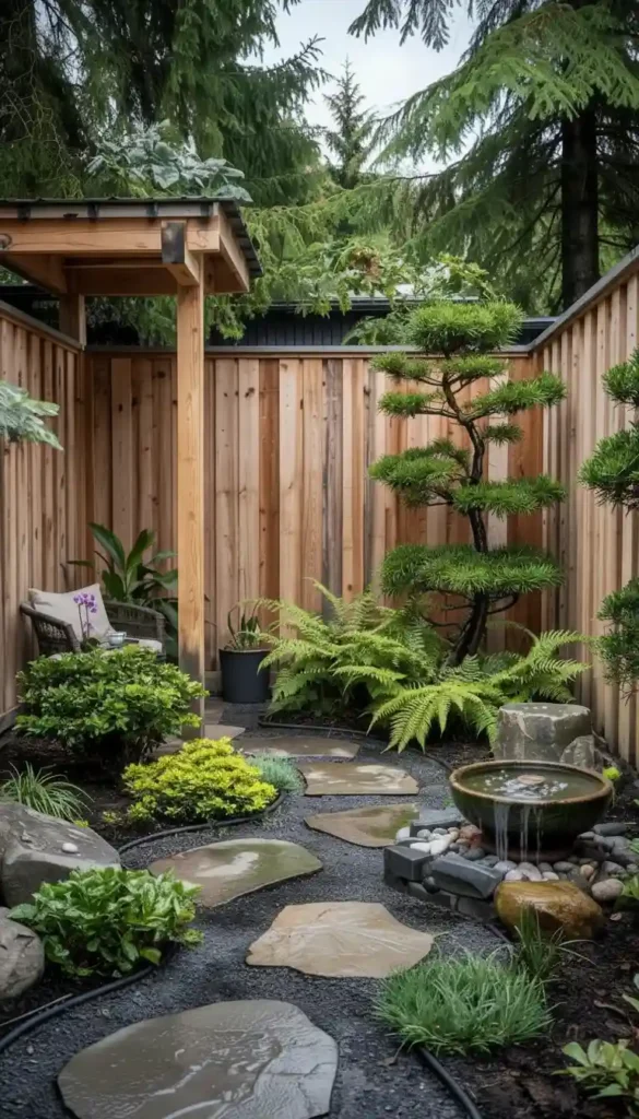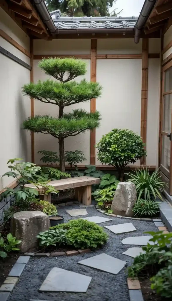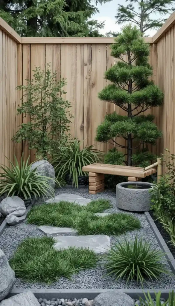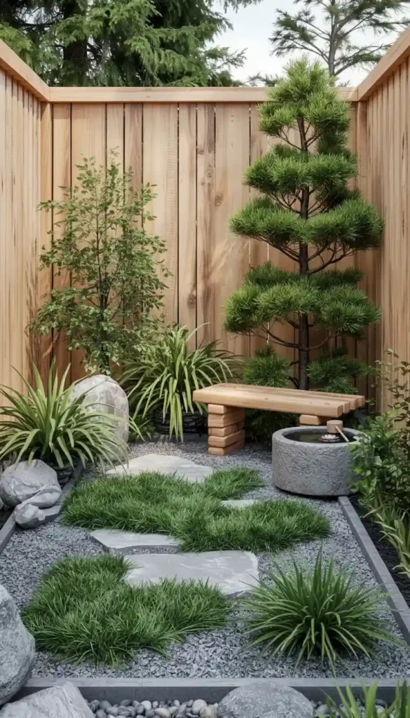 - Bamboo fence or short screen panels creating distinct “rooms” — a tea corner, a gravel Zen area, a seating spot
