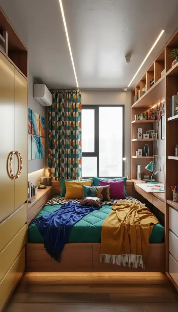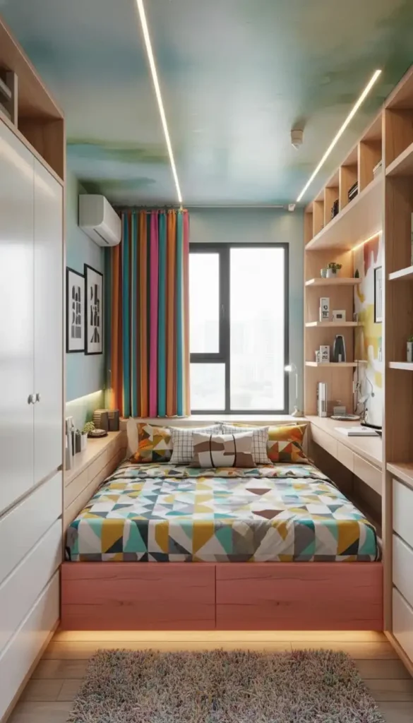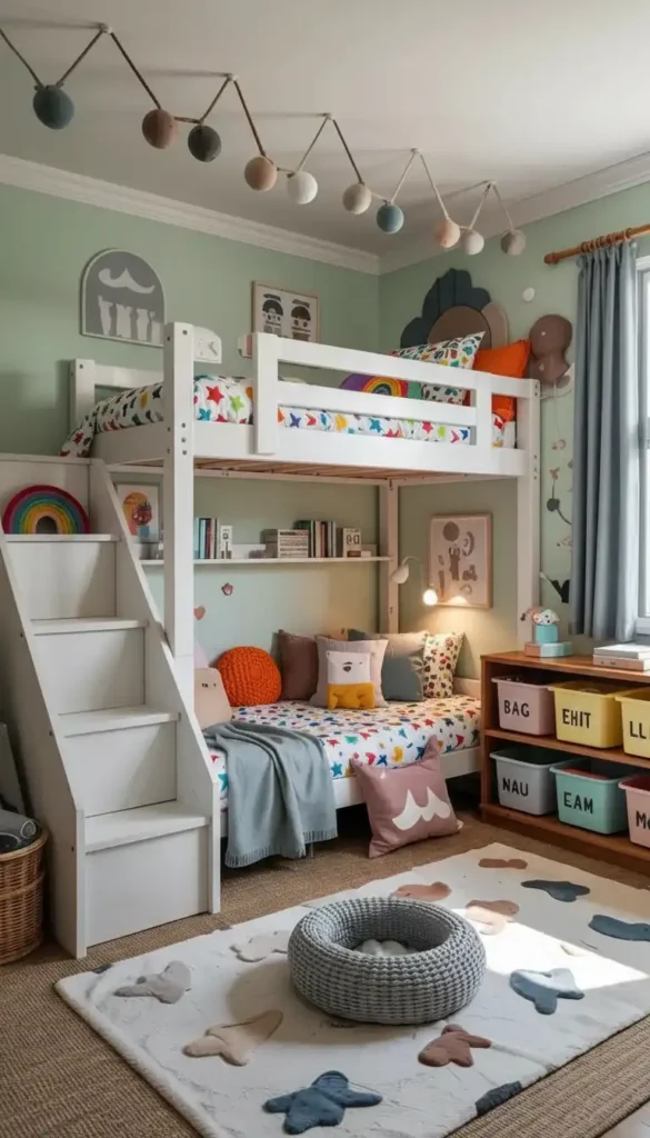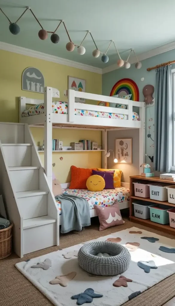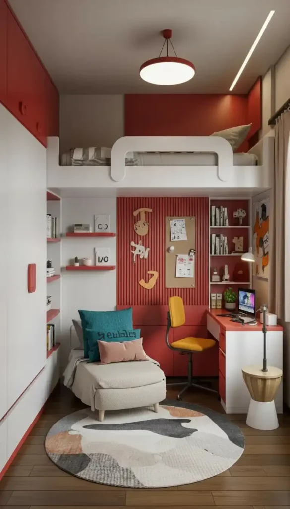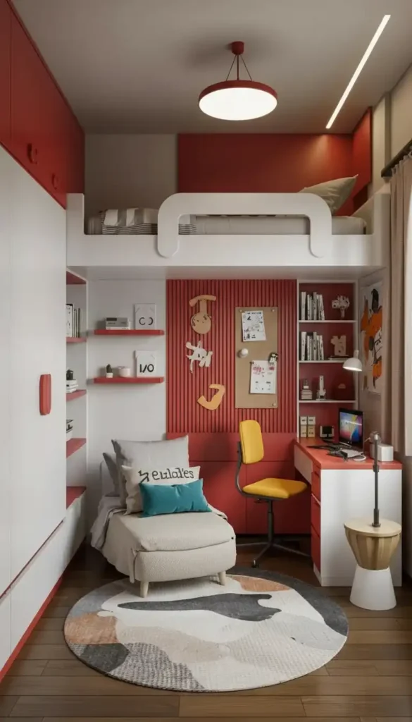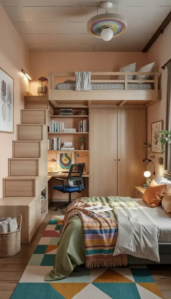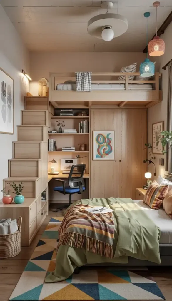 - Minimal decor in the loft zone—just bedding and one small shelf for essentials
