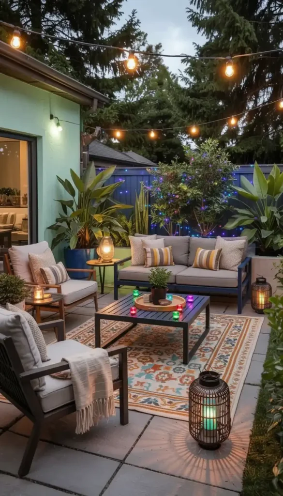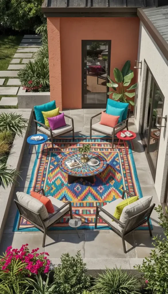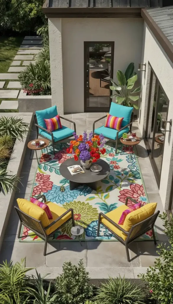 - Outdoor rugs define the sitting footprint and make the space feel finished