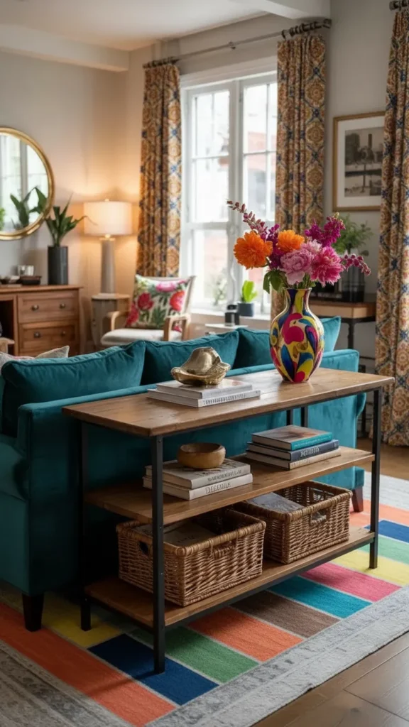 Modern sofa tables succeed when they offer discreet storage without appearing bulky. Small drawers and lower shelves handle everyday items while keeping surfaces serene.