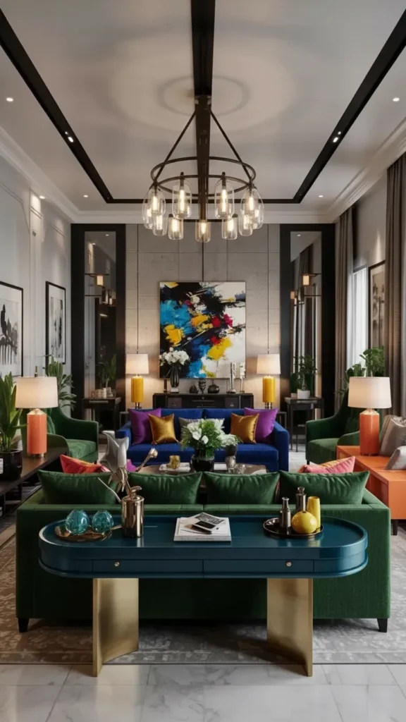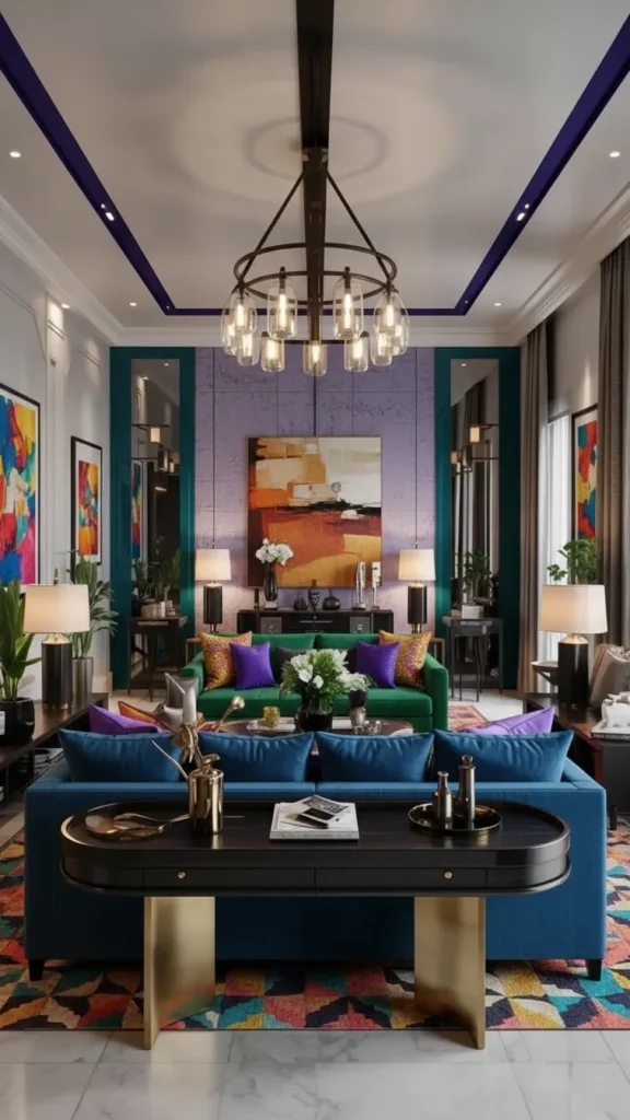 One of 2026’s defining trends pairs narrow-profile sofa tables with stacked lighting that creates an independent zone behind the seating area.