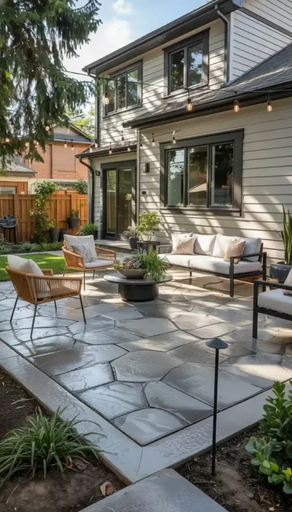 Large patios often benefit from accent borders in a contrasting color to visually define zones without physical barriers.
