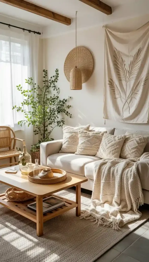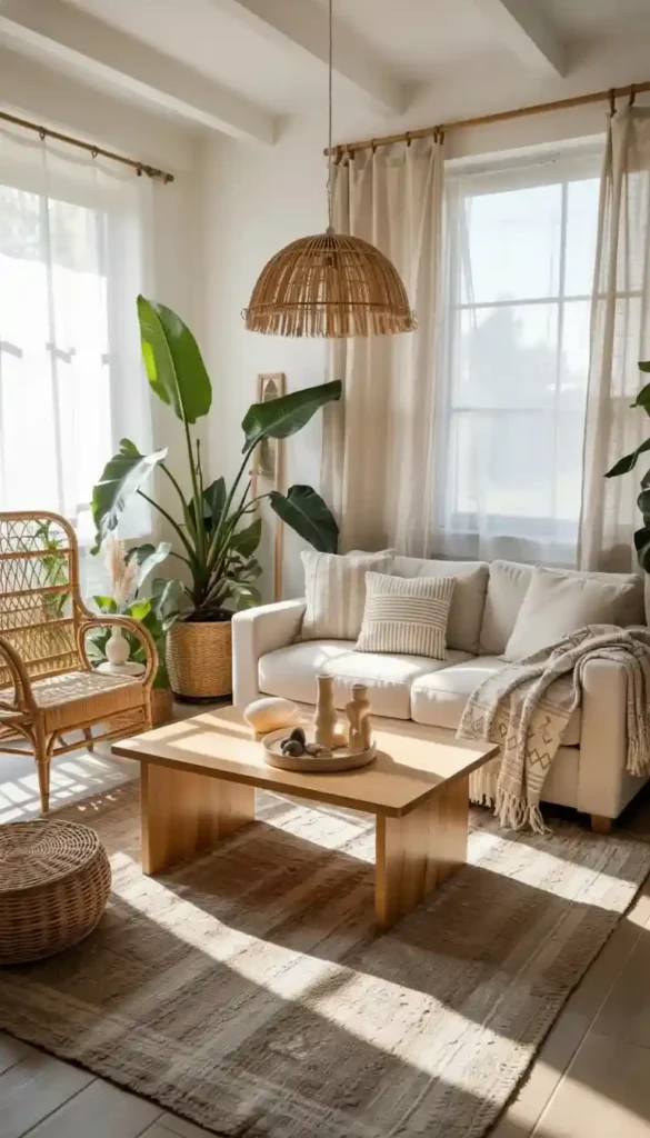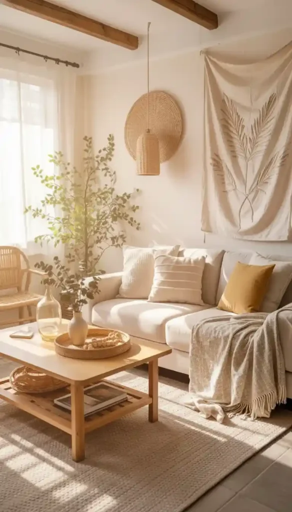 • Bamboo accent tables or trays add warmth without visual heaviness
