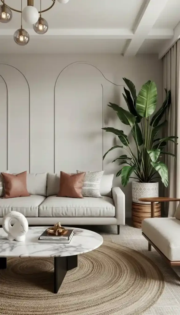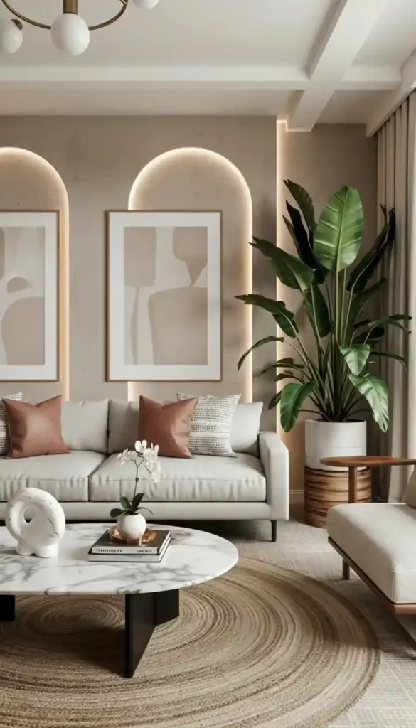 • Add muted coral or dusty rose through a single accent cushion on an otherwise neutral sofa