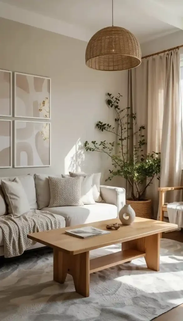 • Light oak or natural wood coffee tables reflect sunlight beautifully