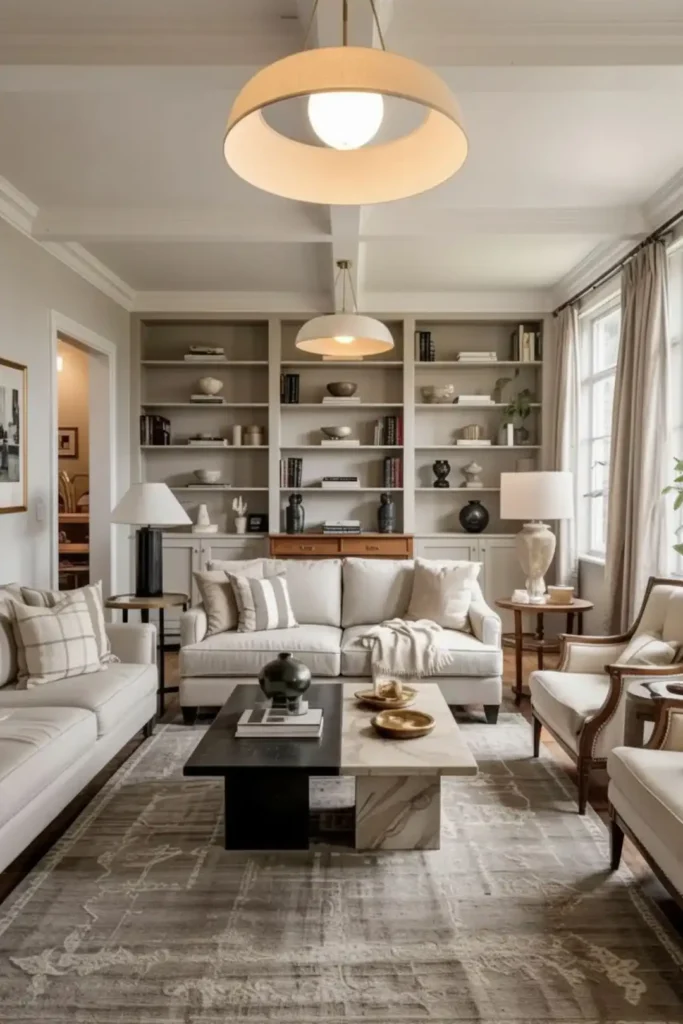 Install a floor lamp beside reading chairs, table lamps on side tables, and a chandelier or pendant for ambient lighting. This multi-layer approach ensures the room looks equally good day and night.