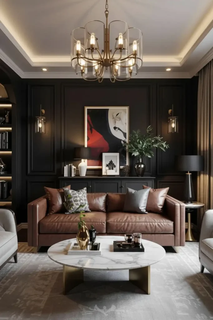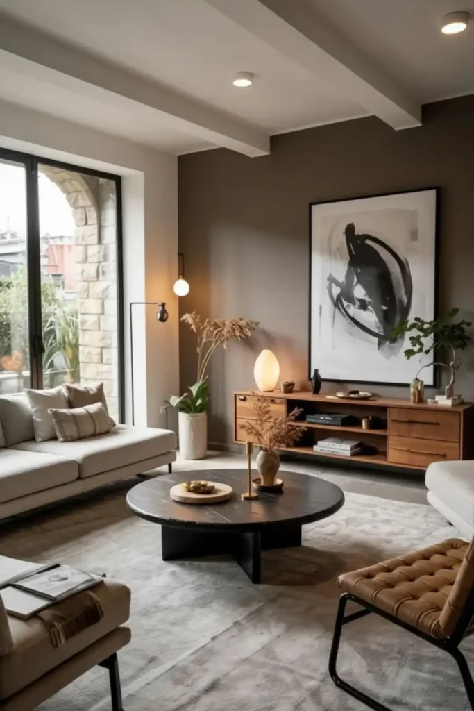 A darker wall behind the TV or sofa anchors the room and conceals visual clutter. Consider charcoal, deep brown, or muted navy—colors that add richness without oppression.