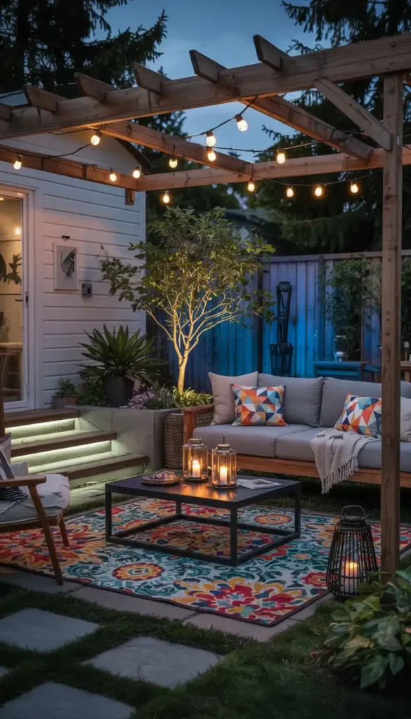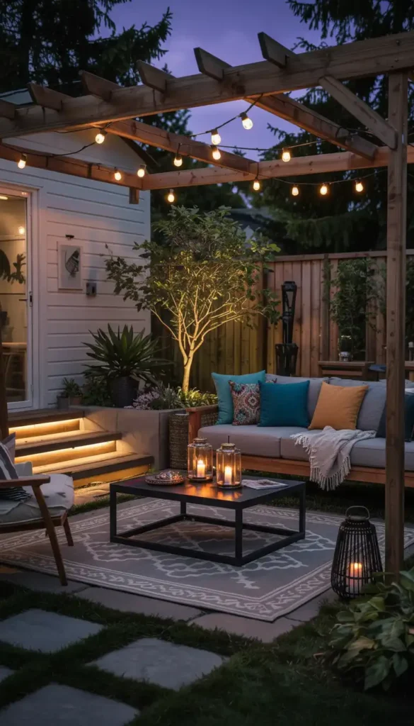 - Include one overhead source (string lights or pergola fixtures)