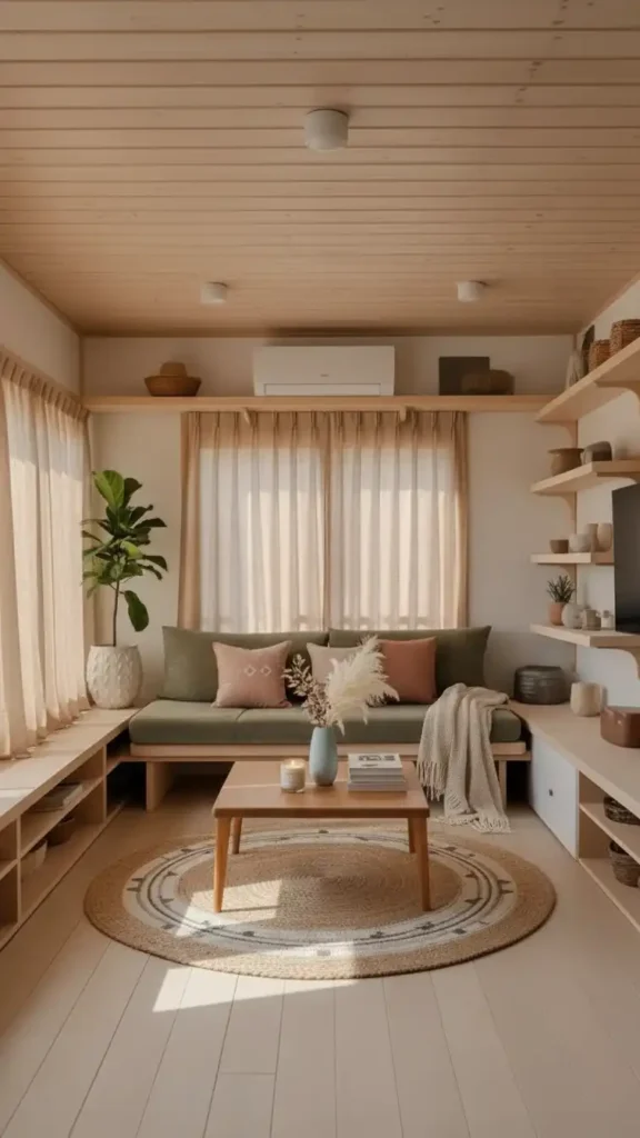 Minimalist design in tiny living rooms embraces the Japandi aesthetic—a blend of Scandinavian simplicity and Japanese serenity. This approach emphasizes natural materials, low-profile furniture, and intentional emptiness that makes small spaces feel calm and spacious.