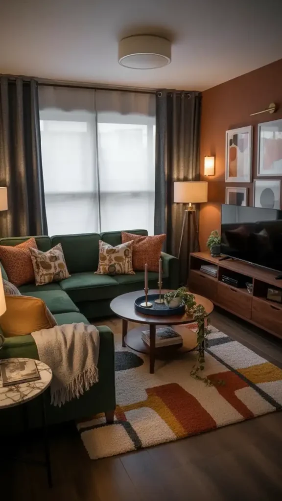 A visual anchor adds psychological warmth to small living rooms.